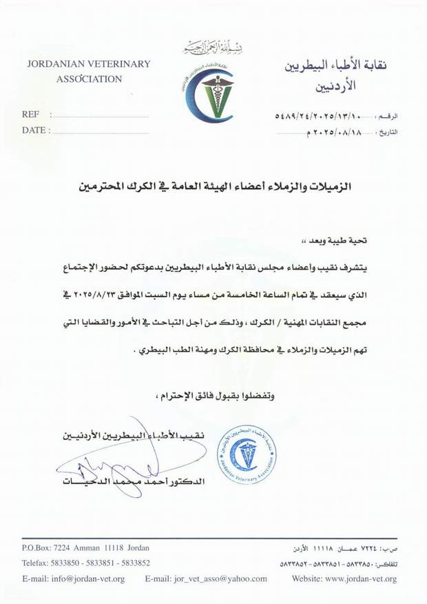 دعوة الزميلات والزملاء الأطباء البيطريين لحضور إجتماع الهيئة العامة للنقابة