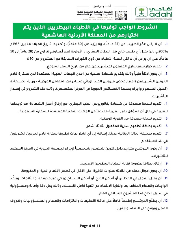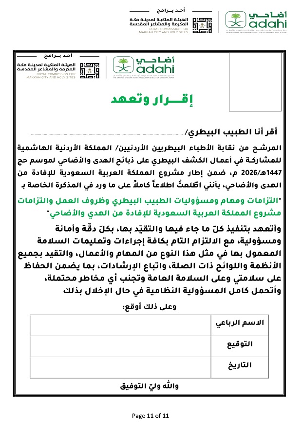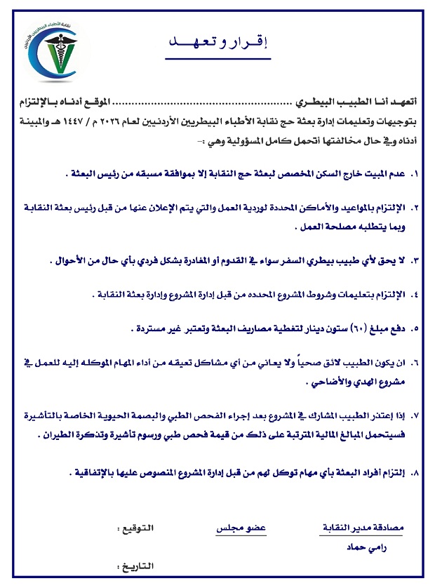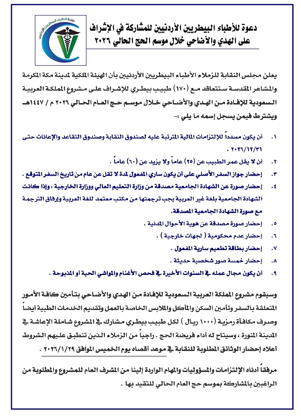 يرجى من الزملاء الأطباء البيطريين الأردنيين الراغبين بالمشاركة في مشروع المملكة العربية السعودية للإفادة من الهدي والأضاحي لموسم حج 2026 م / 1447 هـالتسجيل من خلال الرابط المبين أدناه https://forms.gle/PyRqXPPq8enaZXS78