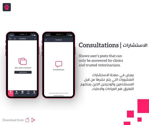 - استشارة طبيب بيطري عن طريق النشر على التطبيق وسيساعدك الأطباء البيطريون فقط .