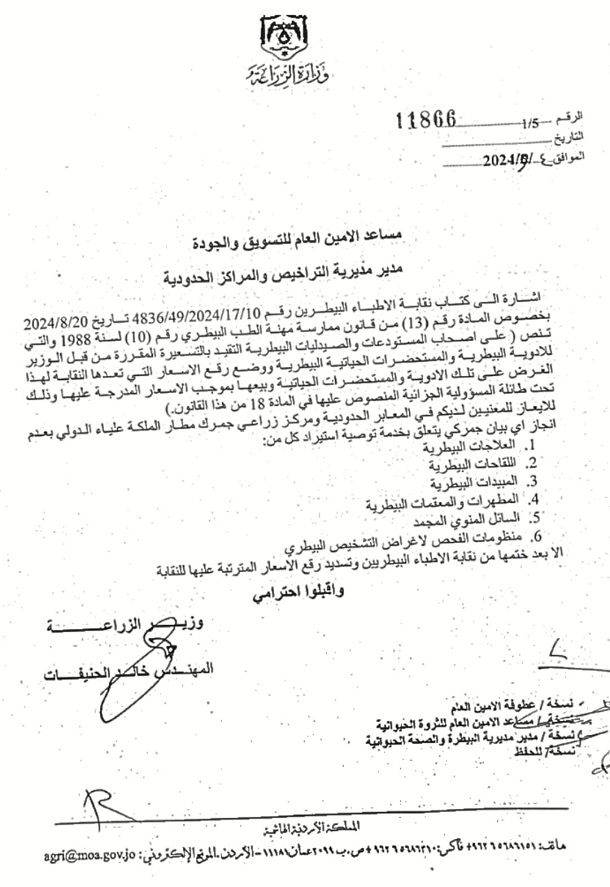 إلا بعد ختمها من نقابة الأطباء البيطريين الأردنيين وتسديد رسوم رقع الأسعار المترتبة عليها للنقابة