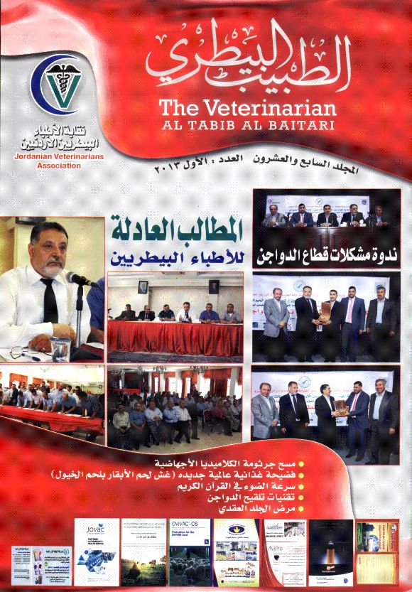 أصدرت النقابة بتاريخ 27/5/2013 العدد الأول من المجلد السابع والعشرون لعام 2013 من مجلة الطبيب البيطري والذي يحتوي على عدد من المقالات والأبحاث العلمية القيمّة . على الزميلات والزملاء الأطباء البيطريين الأُردنيين مراجعة مقر النقابة للحصول على نسخة ورقية من المجلة ، وللراغبين بتحميل المجلة الإلكترونية والتي تم تصميمها من قبل مبرمج الكمبيوتر في النقابة السيد / رامي حماد على شكل كتاب إلكتروني يرجى الضغط على رابط التحميل المبين أدناه :-
